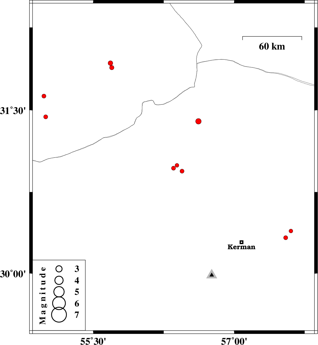 | 2015/09/24 | 10:11:06.2 | 13:41:06.2 | 30.391 | 57.603 | 14 | ML1.8 | Kerman Province, 52 km North-East of Kerman |