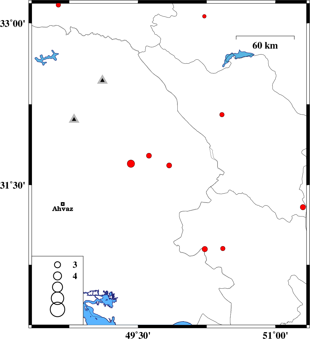 | 2015/10/05 | 20:23:58.3 | 23:53:58.3 | 32.154 | 50.416 | 14 | ML2.2 | Chaharmahal Bakhtiari Province, 18 km South-West of Farsan | ||