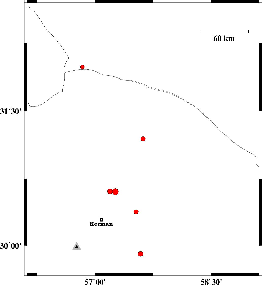 | 2015/10/09 | 06:55:55.9 | 10:25:55.9 | 30.603 | 57.259 | 14 | ML3.7 | Kerman Province, 39 km North-East of Kerman | ||