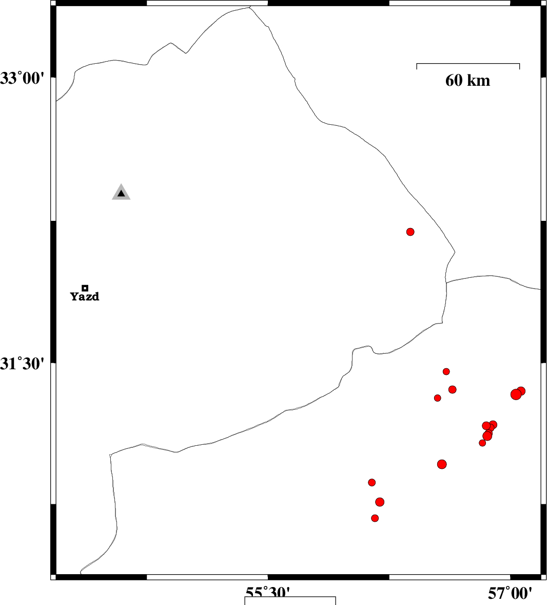 | 2015/10/04 | 10:23:08.1 | 13:53:08.1 | 31.837 | 55.658 | 6 | ML1.9 | Yazd Province, 36 km North-East of Bafq | ||