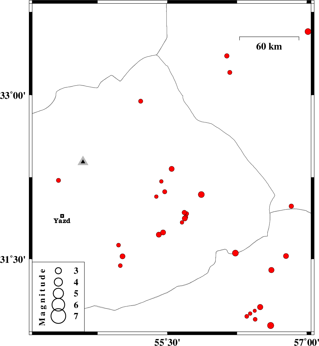| 2015/10/04 | 10:23:08.1 | 13:53:08.1 | 31.837 | 55.658 | 6 | ML1.9 | Yazd Province, 36 km North-East of Bafq | ||