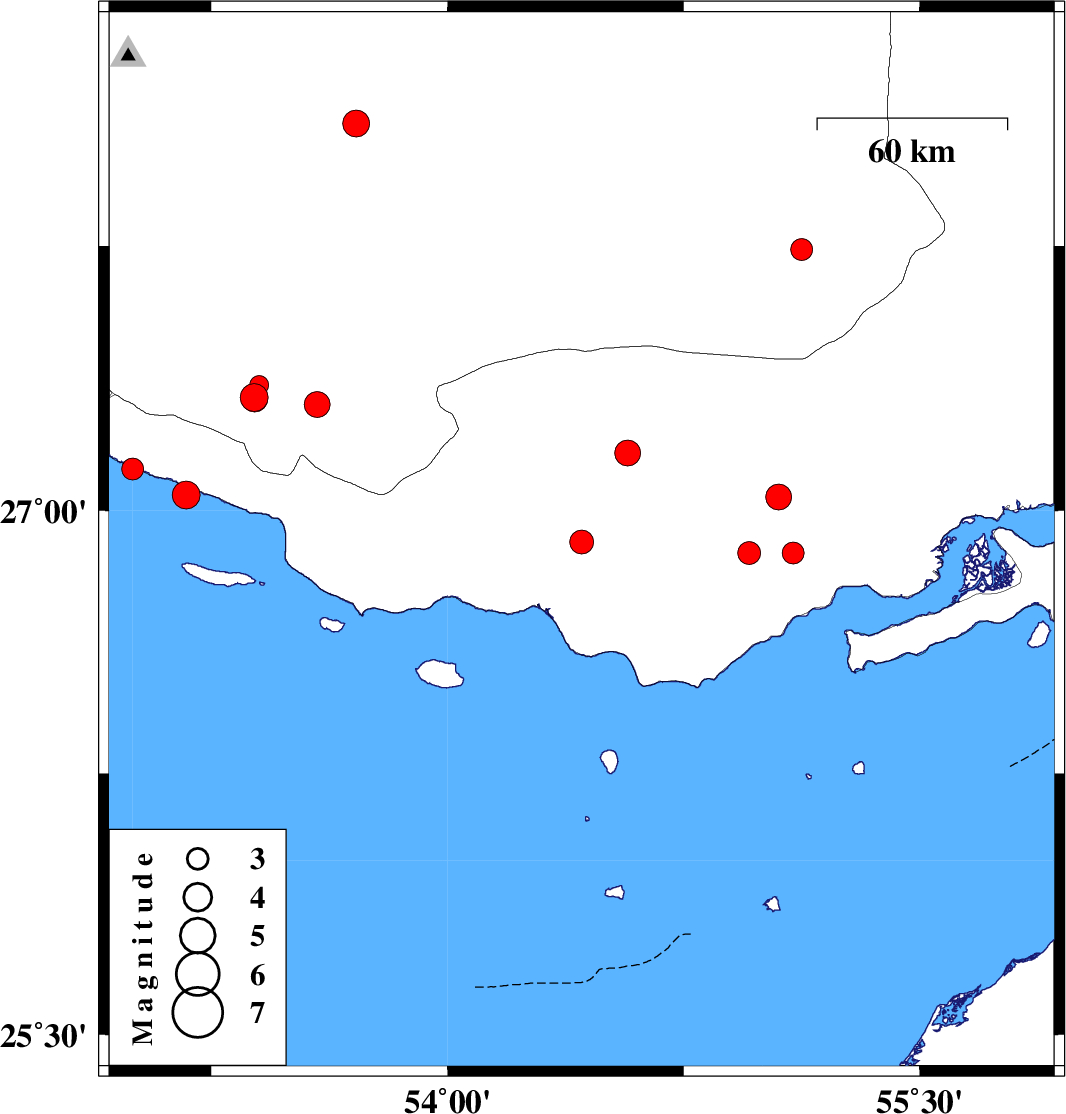 | 2015/10/21 | 00:40:30.7 | 04:10:30.7 | 27.039 | 55.052 | 16 | ML3.7 | Hormozgan Province, 60 km North-East of Bandar-e lengeh | ||