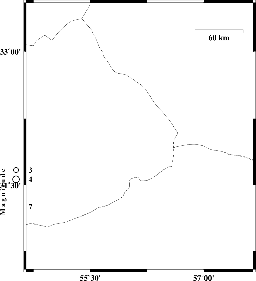 | 2015/10/17 | 01:17:19.7 | 04:47:19.7 | 33.103 | 57.54 | 14 | ML2.3 | Yazd Province, 79 km South-East of Tabas |