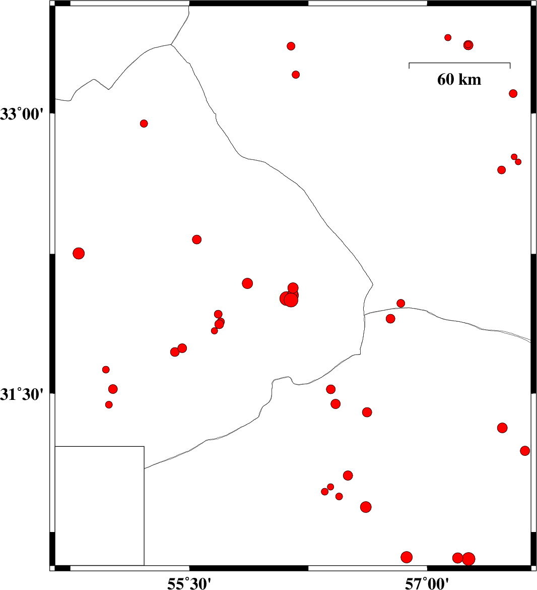 | 2015/10/09 | 17:17:01.4 | 20:47:01.4 | 30.608 | 57.191 | 16 | ML3 | Kerman Province, 37 km North-East of Kerman | ||