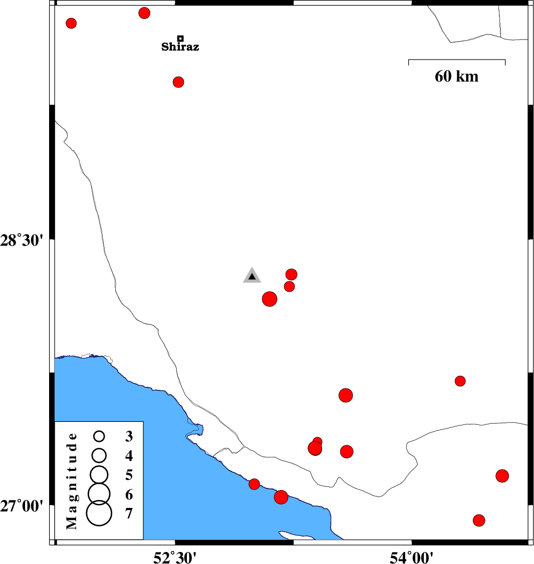 | 2015/10/12 | 08:34:58.5 | 12:04:58.5 | 29.376 | 52.521 | 18 | ML3.1 | Fars Province, 27 km South of Shiraz | ||