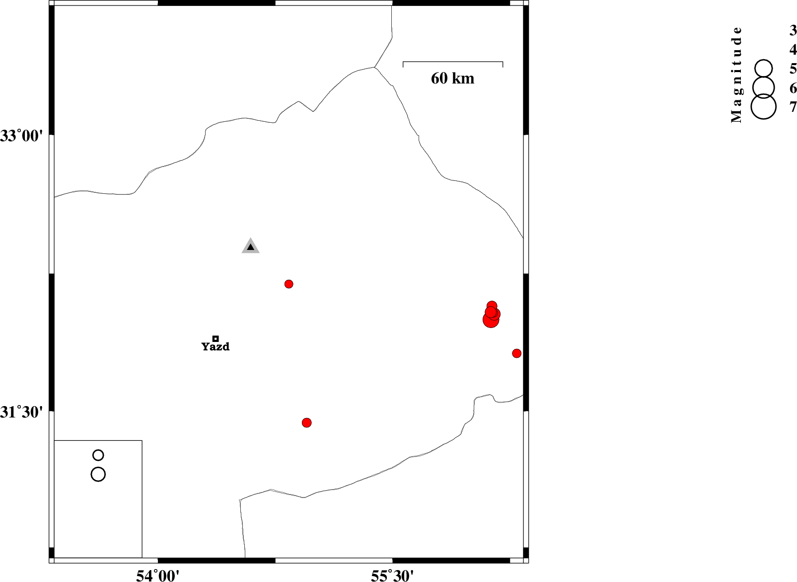 | 2015/10/29 | 15:48:18.9 | 19:18:18.9 | 32 | 56.128 | 14 | ML4.7 | Yazd Province, 82 km North-East of Bafq | download | |