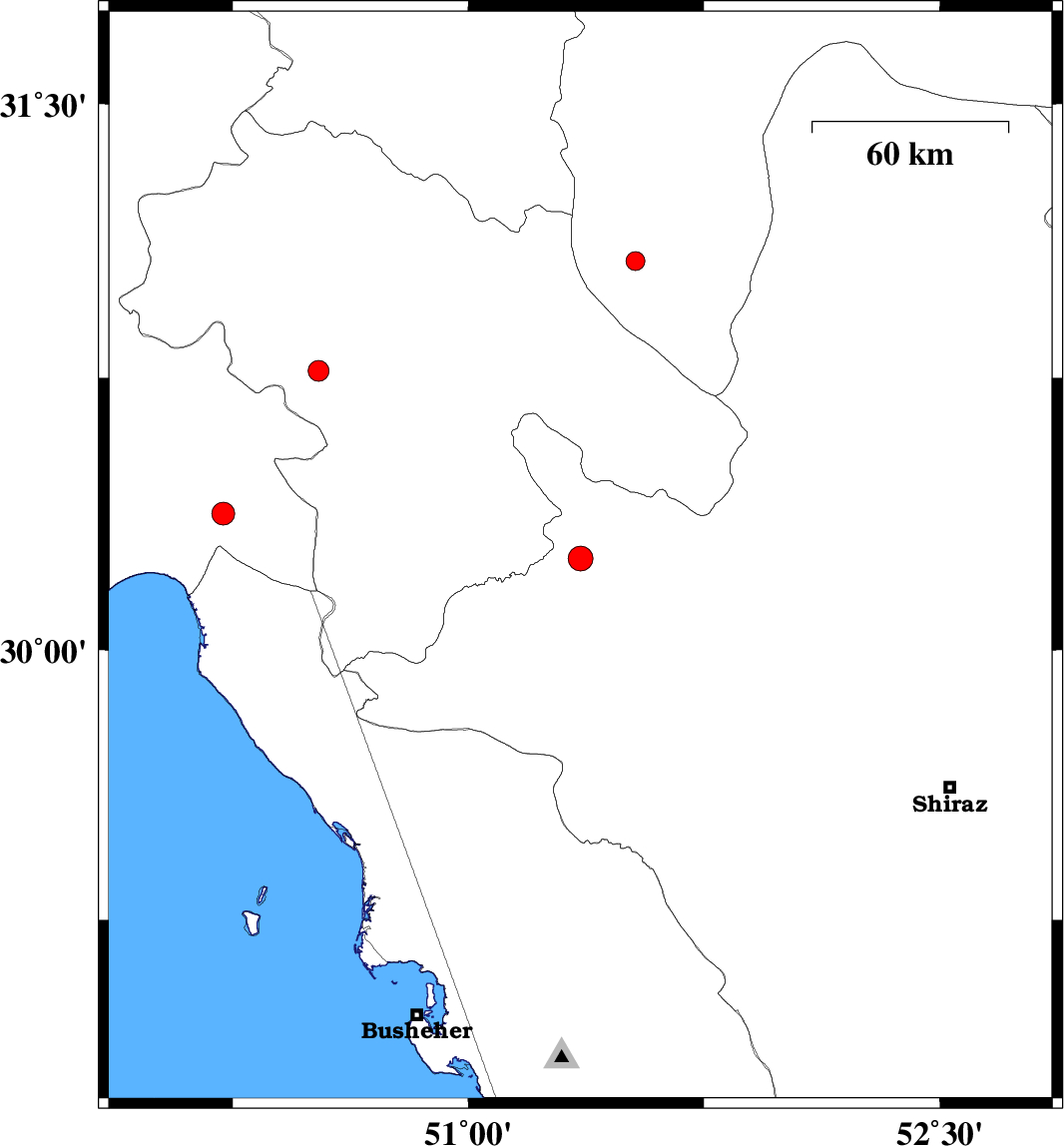 | 2015/11/03 | 03:53:36.1 | 07:23:36.1 | 30.376 | 50.22 | 15 | ML3.3 | Khoozestan Province, 25 km South of Behbahan |
