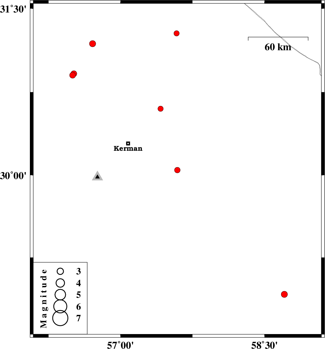 | 2015/11/07 | 17:12:22.5 | 20:42:22.5 | 30.046 | 57.592 | 6 | ML2.7 | Kerman Province, 56 km South-East of Kerman | ||