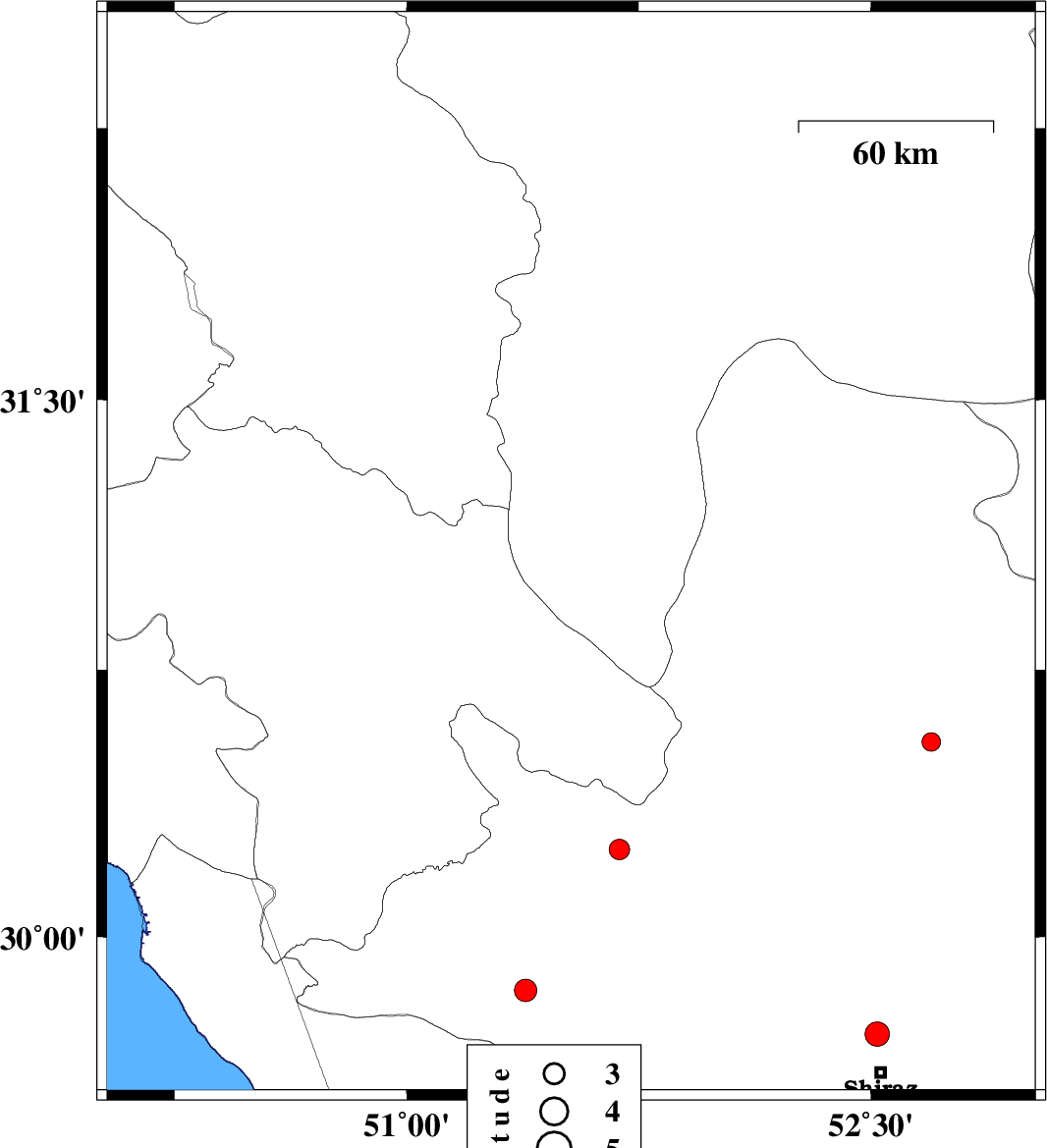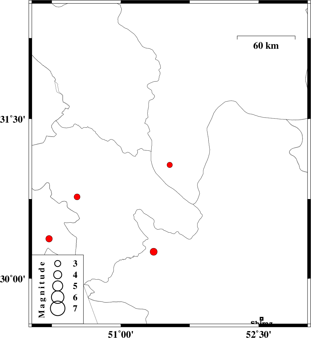 | 2015/11/03 | 03:53:36.1 | 07:23:36.1 | 30.376 | 50.22 | 15 | ML3.3 | Khoozestan Province, 25 km South of Behbahan |