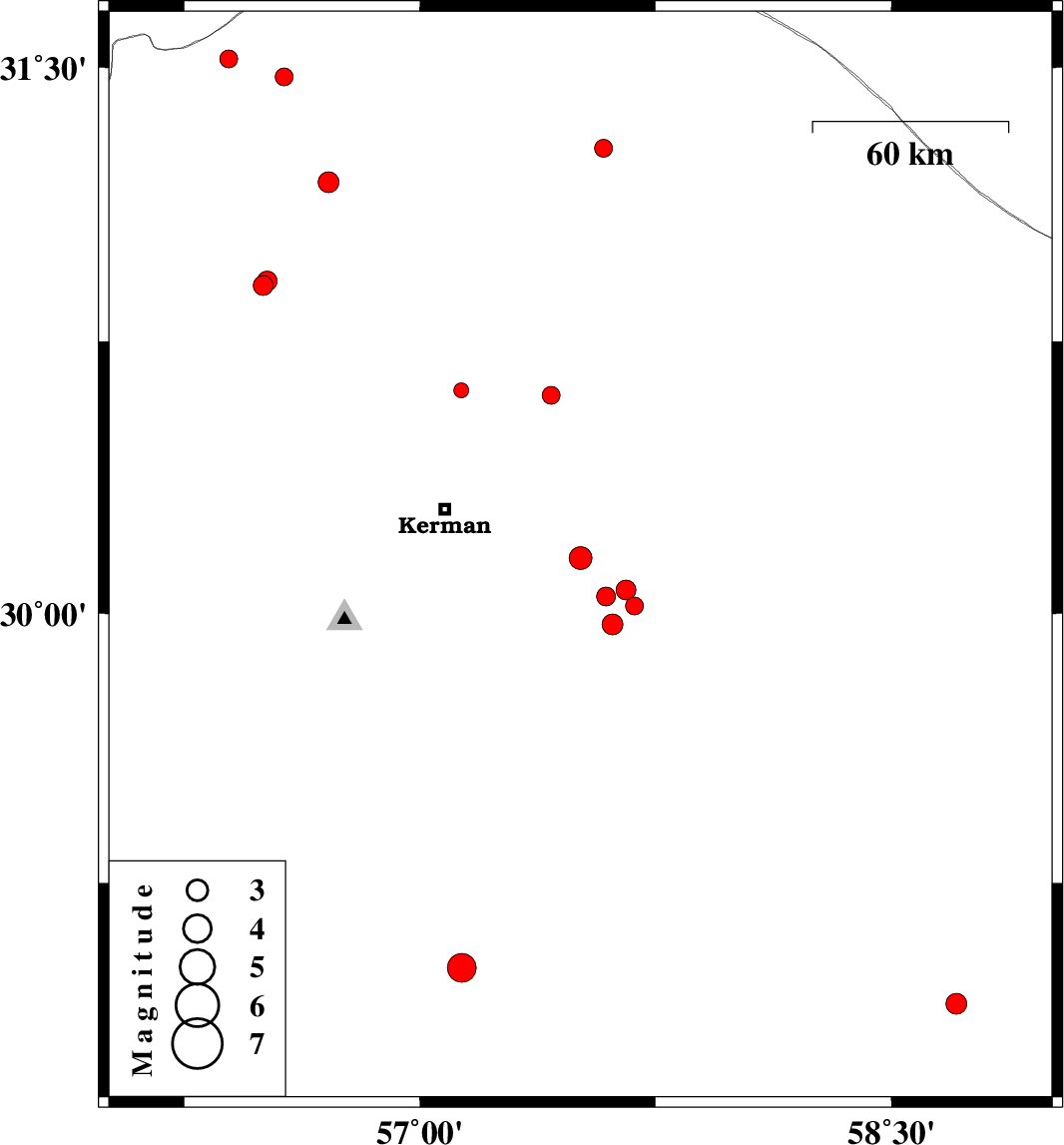 | 2015/11/07 | 17:12:22.5 | 20:42:22.5 | 30.046 | 57.592 | 6 | ML2.7 | Kerman Province, 56 km South-East of Kerman | ||