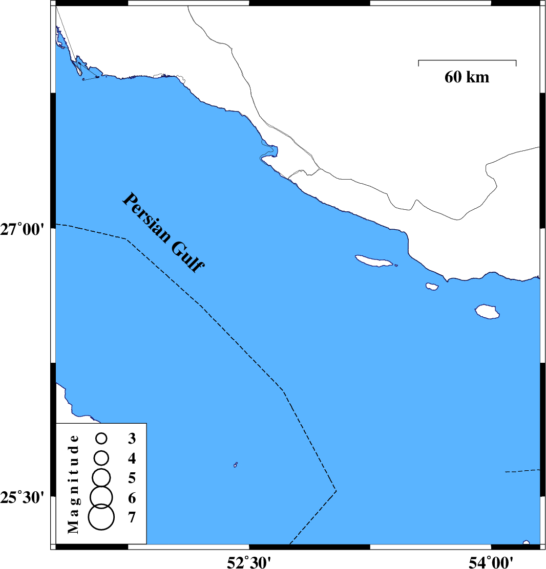 | 2015/11/22 | 03:11:07.2 | 06:41:07.2 | 26.73 | 52.802 | 17 | ML3.6 | Persian Gulf, 91 km South of Mehr |