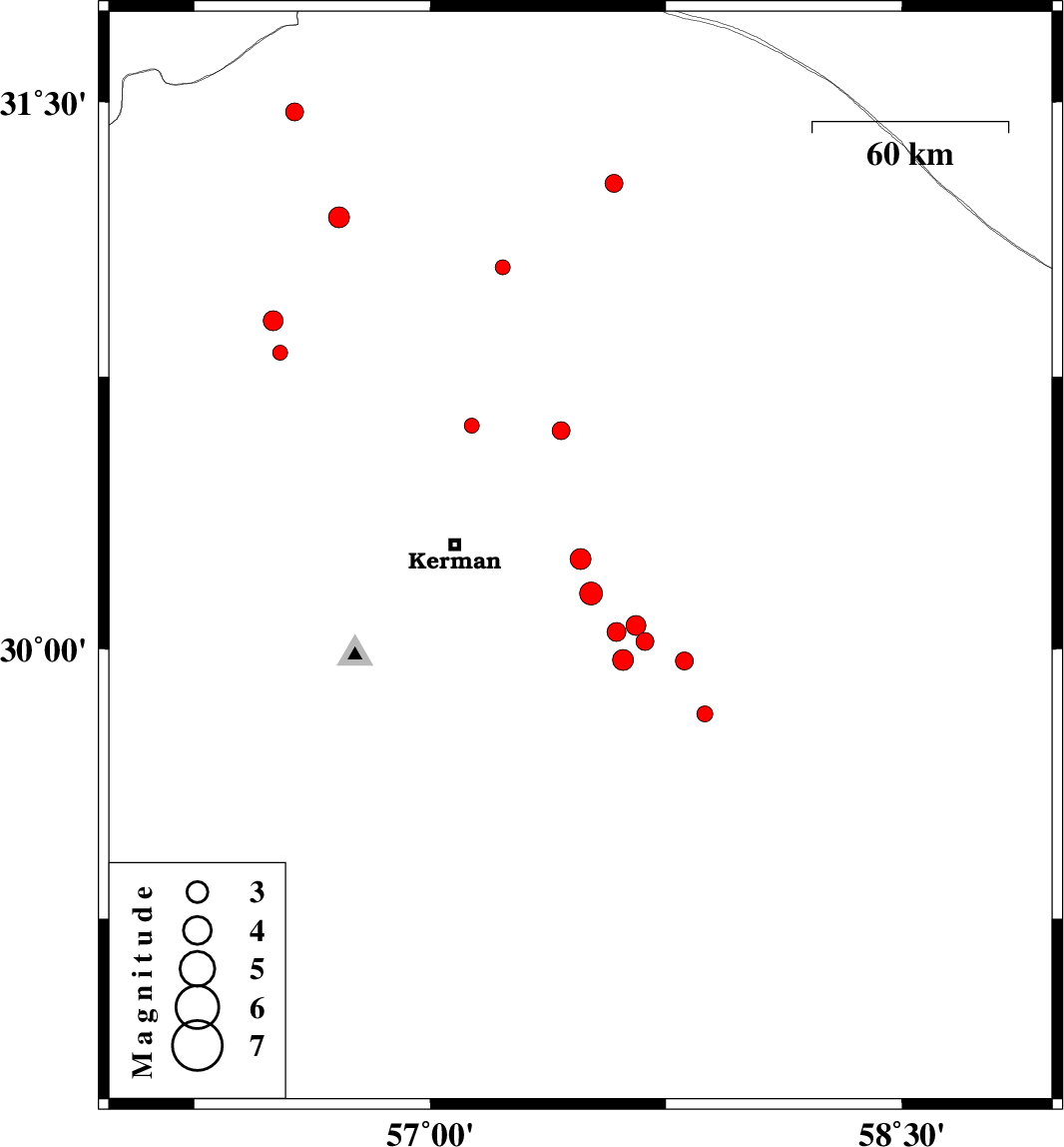 | 2015/11/19 | 15:01:08.7 | 18:31:08.7 | 29.969 | 57.613 | 14 | ML3 | Kerman Province, 62 km South-East of Kerman | ||