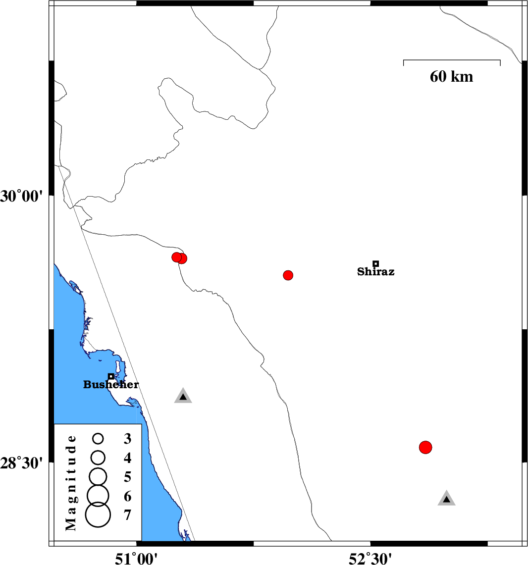 | 2015/11/30 | 12:49:52.1 | 16:19:52.1 | 29.647 | 51.288 | 14 | ML3.1 | Bushehr Province, 35 km -West of Kazerun | ||