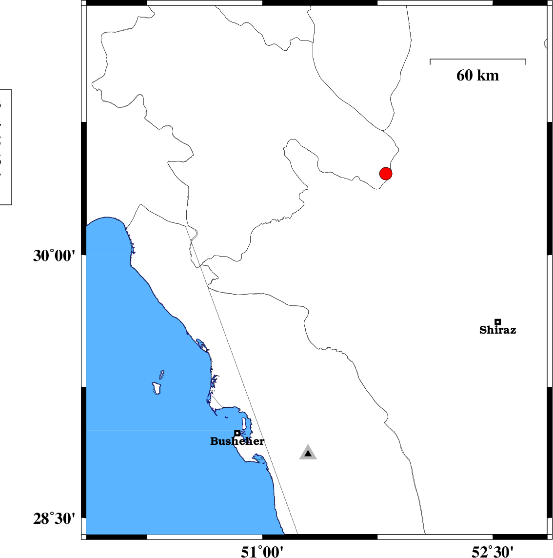 | 2015/11/30 | 20:45:43.2 | 00:15:43.2 | 29.655 | 51.257 | 14 | ML2.8 | Bushehr Province, 39 km -West of Kazerun | ||
