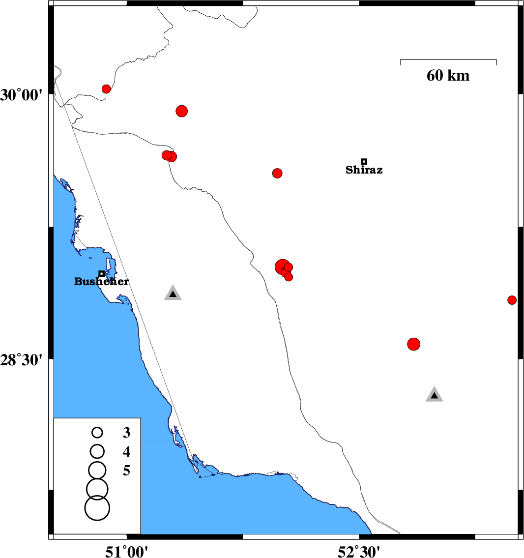 | 2015/11/30 | 12:49:52.1 | 16:19:52.1 | 29.647 | 51.288 | 14 | ML3.1 | Bushehr Province, 35 km -West of Kazerun | ||
