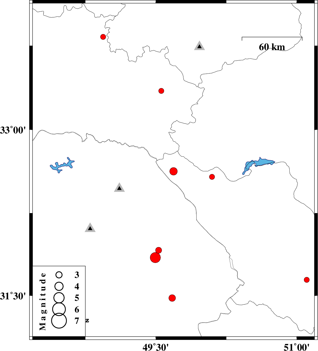 | 2015/11/12 | 01:22:44.1 | 04:52:44.1 | 33.828 | 48.939 | 6 | ML2.6 | Lorestan Province, 18 km -East of Borujerd |