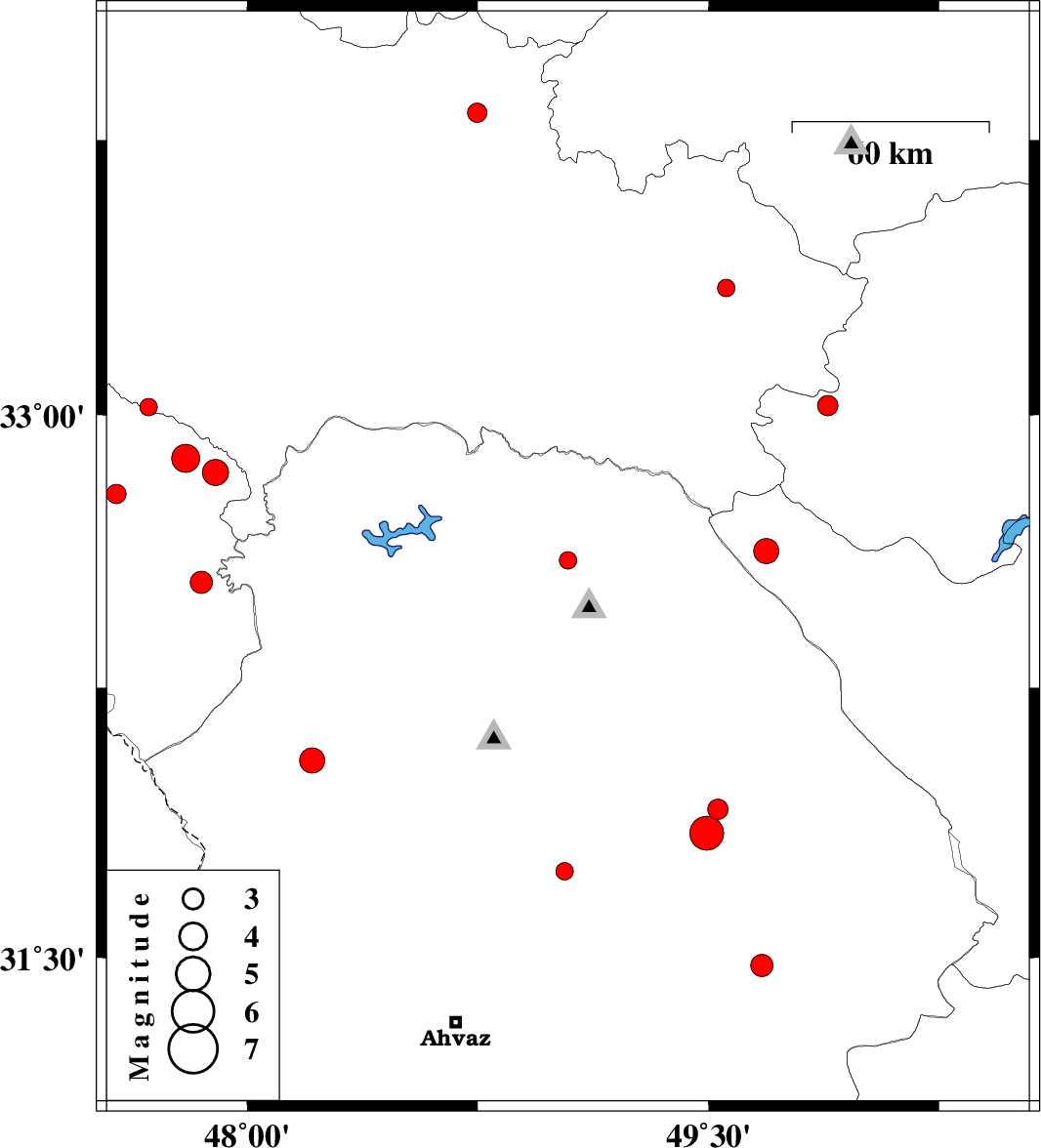 | 2015/12/03 | 19:48:37.3 | 23:18:37.3 | 31.478 | 49.674 | 16 | ML3.2 | Khoozestan Province, 22 km -West of Bagh Malek | ||