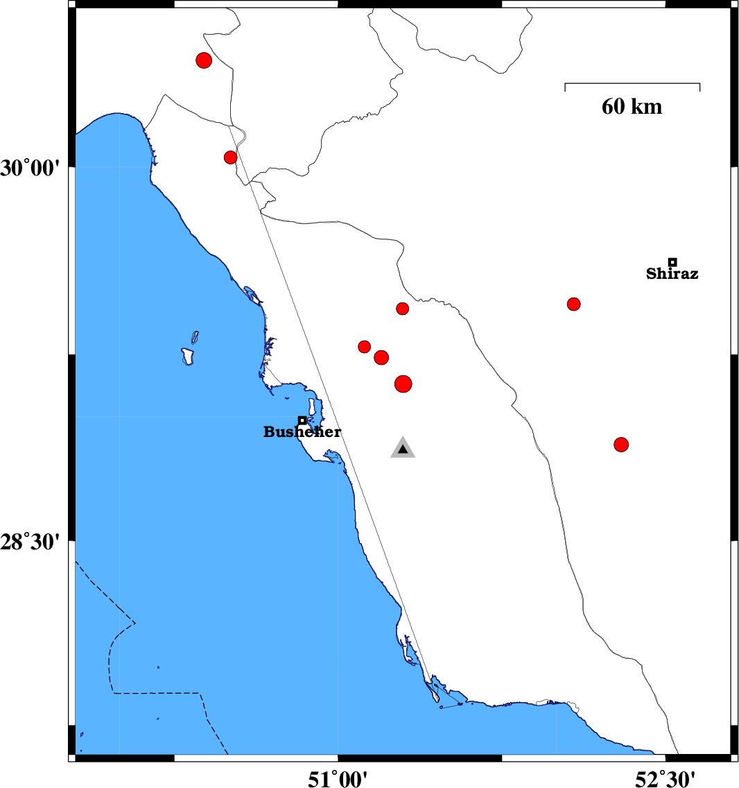 | 2016/01/06 | 06:10:57.5 | 09:40:57.5 | 29.132 | 51.298 | 14 | ML3.5 | Bushehr Province, 17 km South of Borazjan | ||