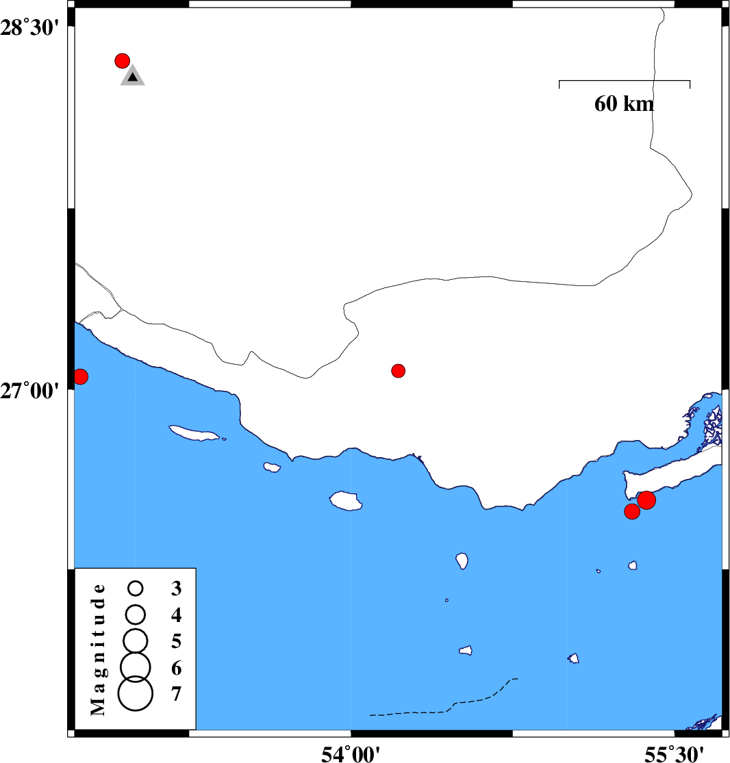 | 2015/12/16 | 10:46:31.6 | 14:16:31.6 | 27.052 | 52.745 | 28 | ML3.3 | Persian Gulf, 57 km South-West of Mehr |