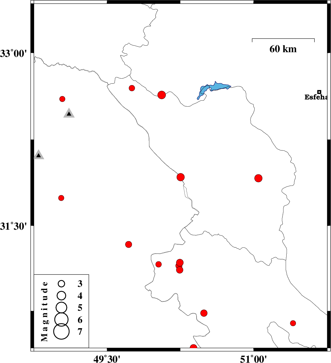 | 2015/12/23 | 02:18:51.4 | 05:48:51.4 | 32.636 | 50.06 | 17 | ML3.6 | Esfahan Province, 20 km North of Chelgard | ||