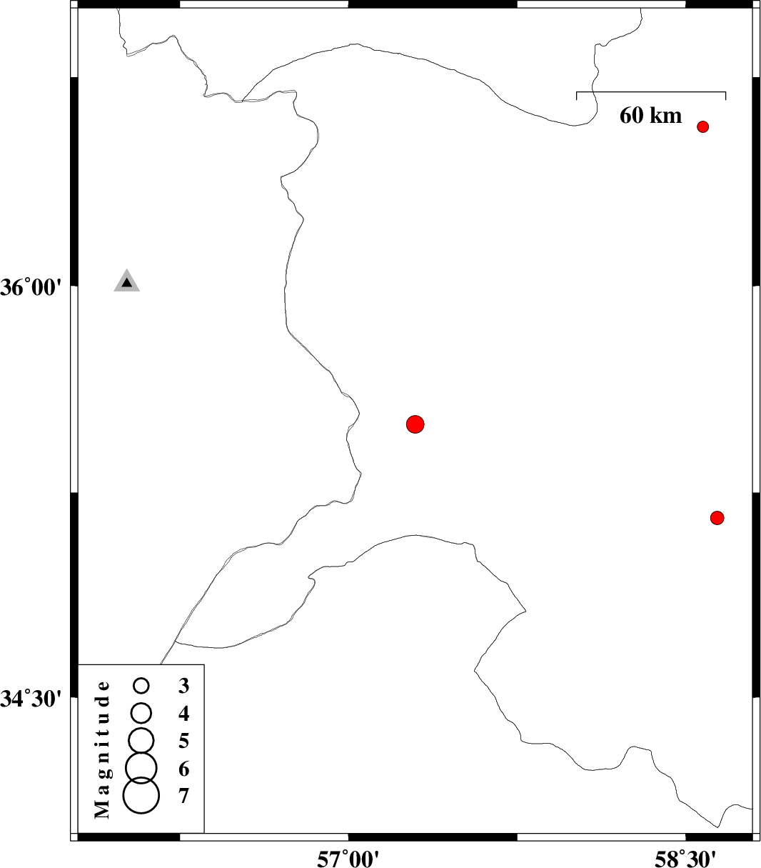 | 2016/01/16 | 08:54:16.1 | 12:24:16.1 | 35.498 | 57.296 | 17 | ML3.5 | Khorasan(center) Province, 65 km North-West of Bardeskan | ||
