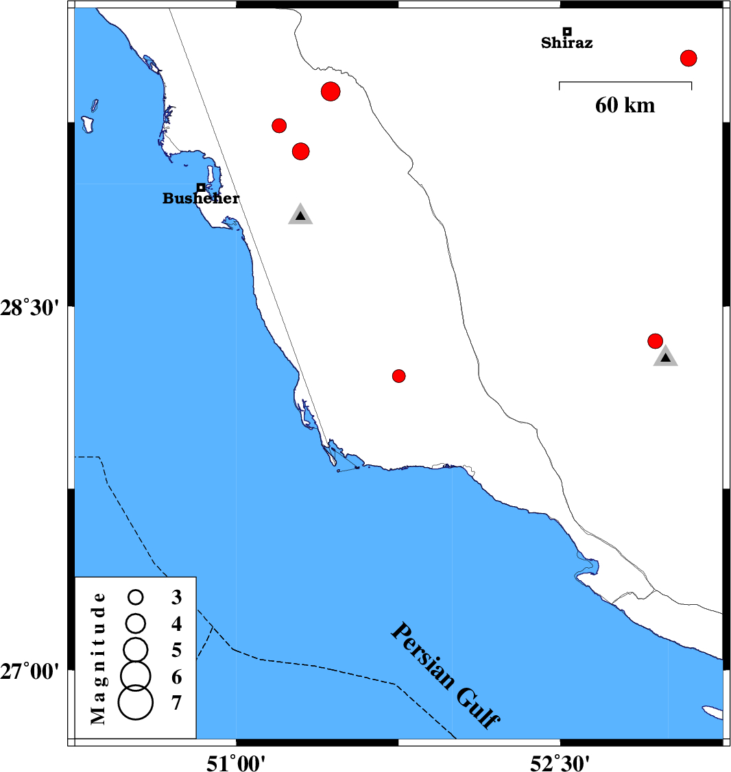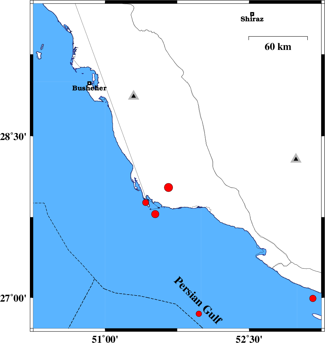 | 2016/01/06 | 06:10:57.5 | 09:40:57.5 | 29.132 | 51.298 | 14 | ML3.5 | Bushehr Province, 17 km South of Borazjan | ||