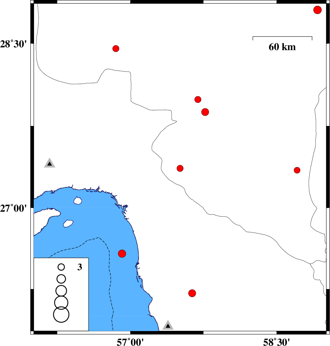 | 2016/01/02 | 17:36:17.2 | 21:06:17.2 | 27.345 | 58.71 | 15 | ML2.8 | Kerman Province, 120 km -East of Manujan | ||