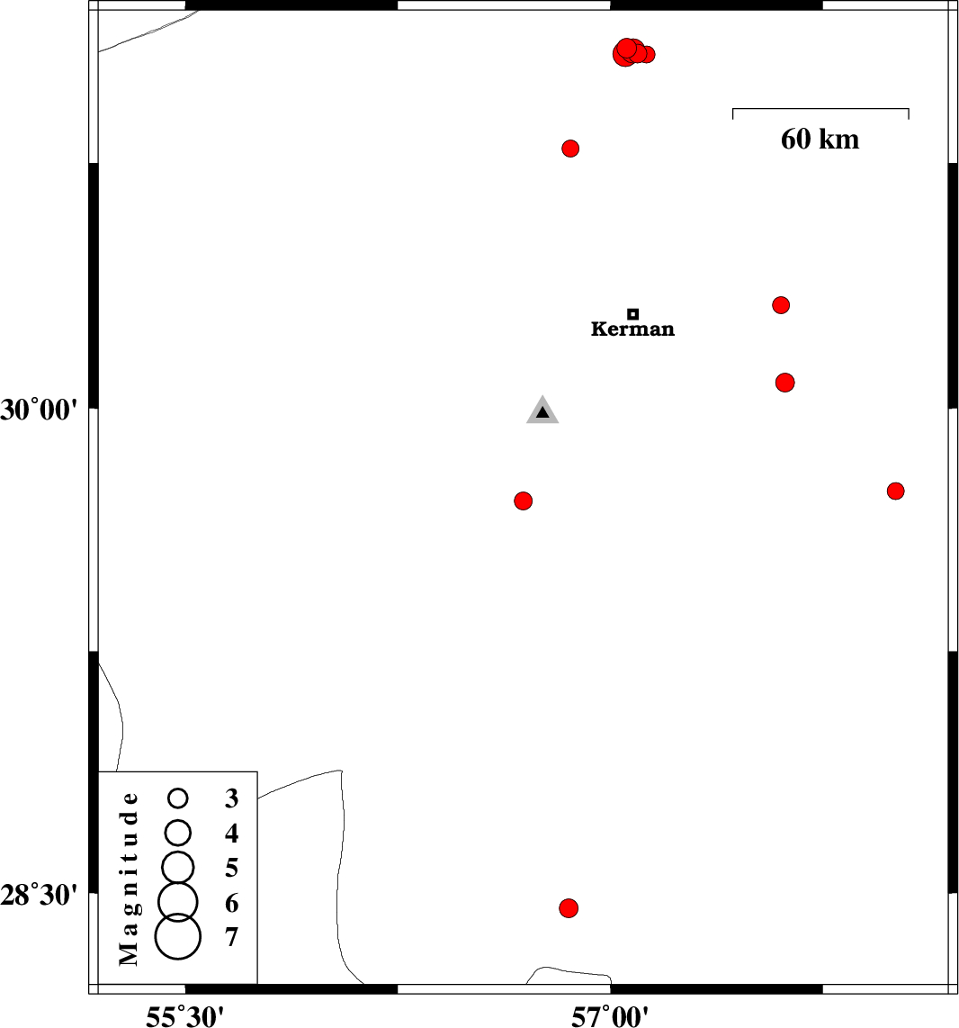 | 2015/12/28 | 13:22:36.8 | 16:52:36.8 | 30.315 | 57.602 | 14 | ML2.7 | Kerman Province, 50 km -East of Kerman |