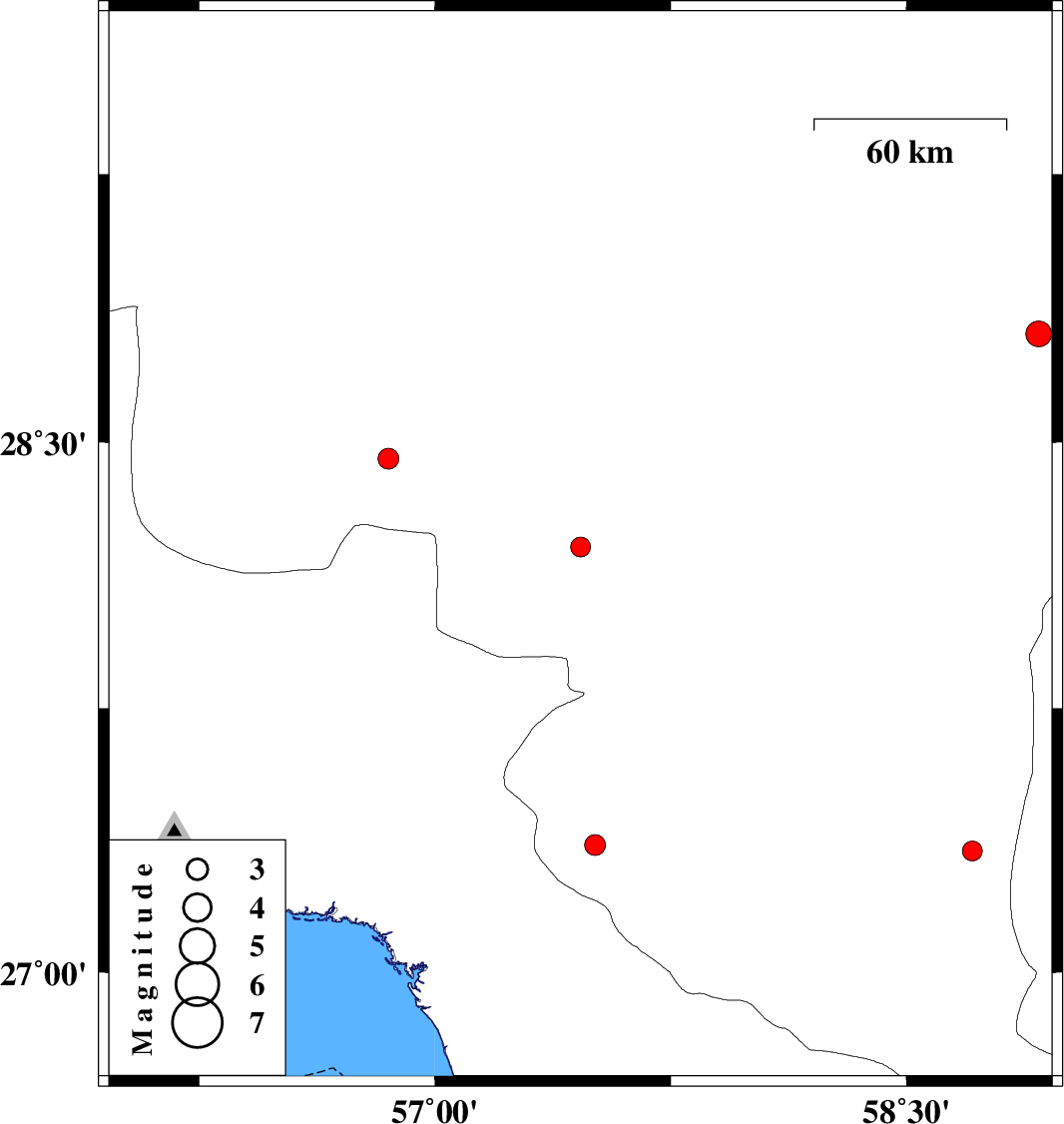 | 2016/01/02 | 17:36:17.2 | 21:06:17.2 | 27.345 | 58.71 | 15 | ML2.8 | Kerman Province, 120 km -East of Manujan |