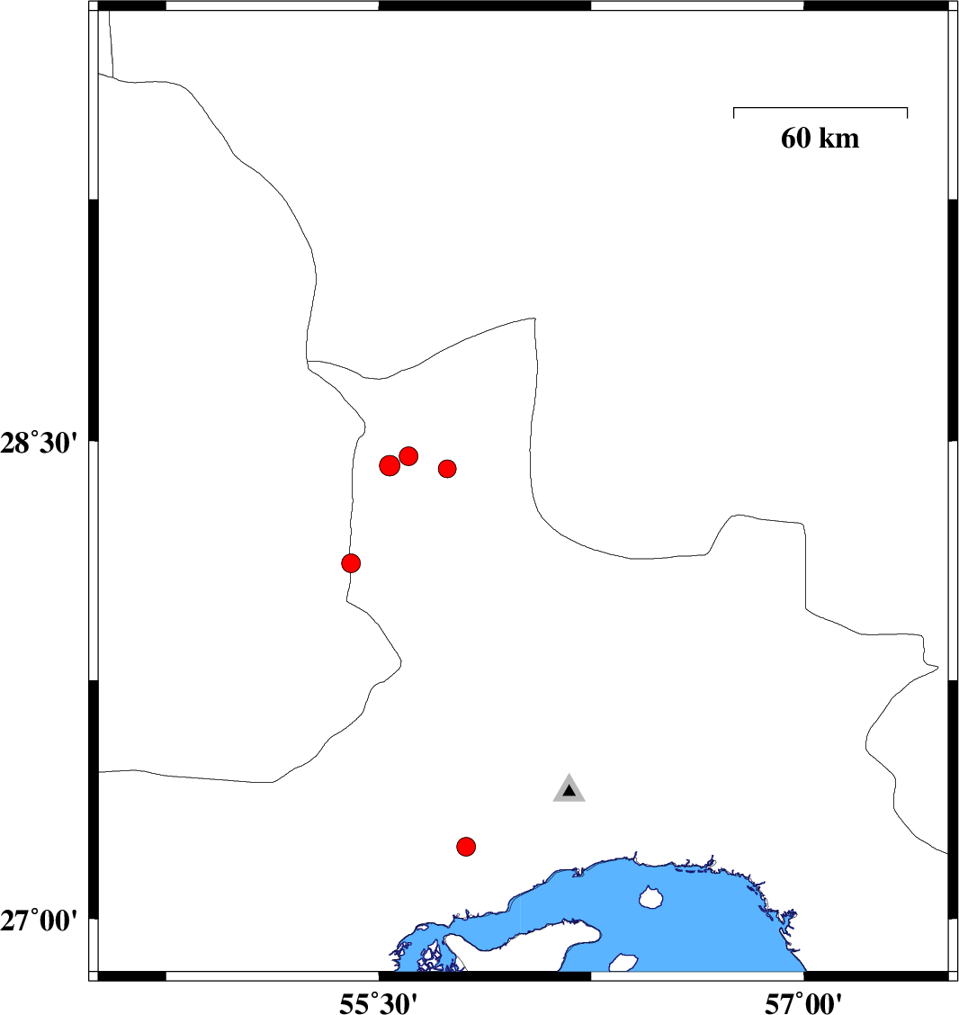 | 2016/01/18 | 07:50:52.6 | 11:20:52.6 | 27.982 | 54.881 | 18 | ML3.1 | Fars Province, 63 km North-East of Lar |