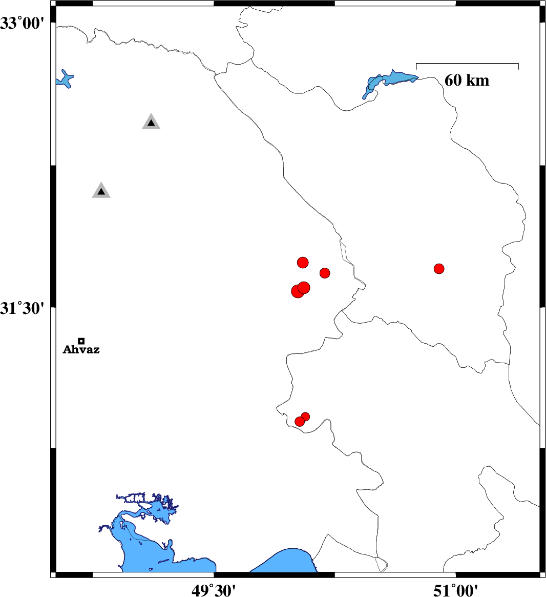 2016/02/19 | 17:05:41.6 | 20:35:41.6 | 31.585 | 50.021 | 15 | ML3.7 | Khoozestan Province, 14 km -East of Bagh Malek | ||