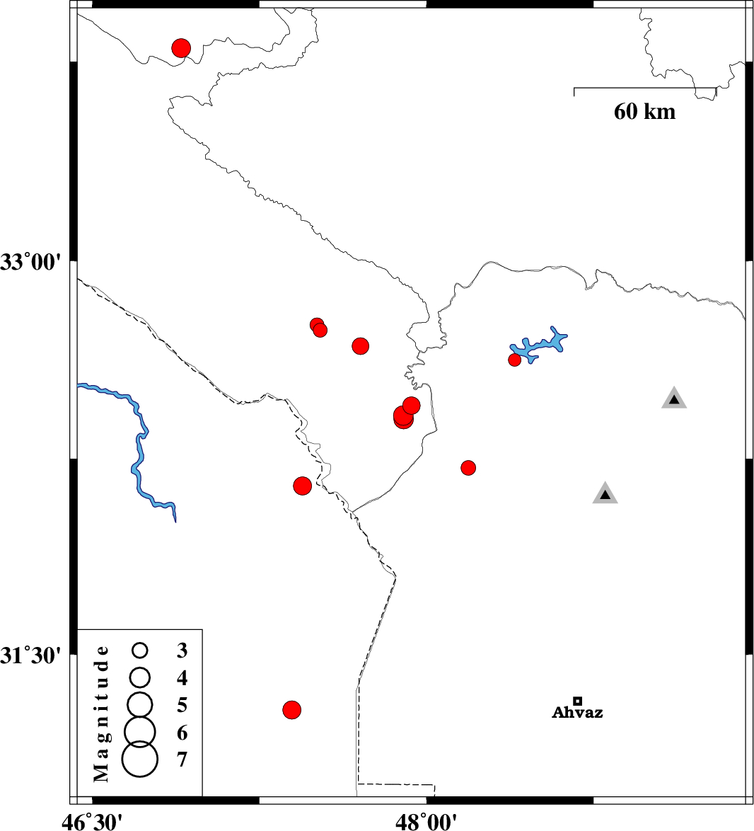 | 2016/02/19 | 03:30:44.8 | 07:00:44.8 | 32.452 | 47.932 | 14 | ML3.5 | Ilam Province, 39 km -West of Andimeshk | ||