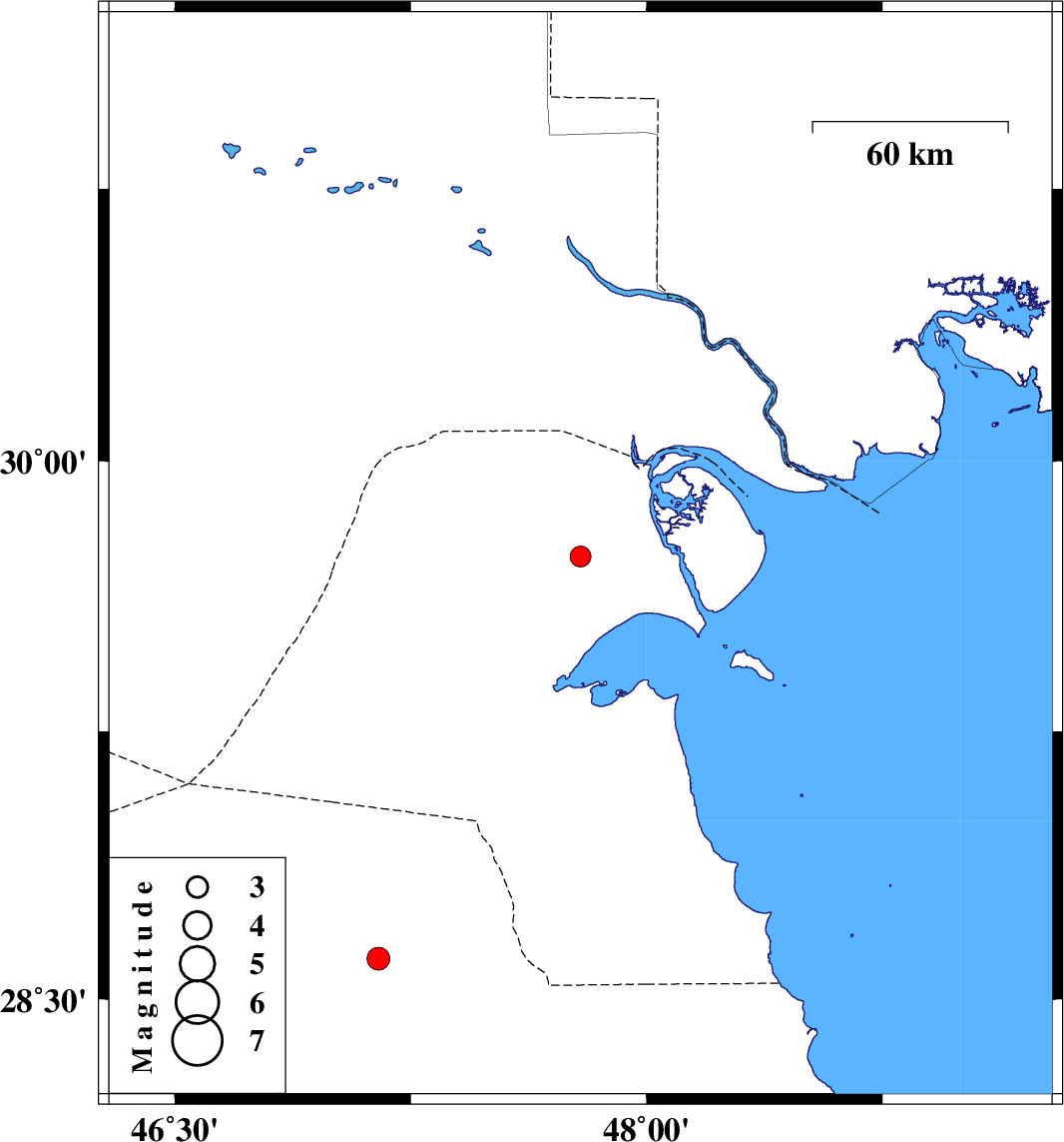 | 2016/02/18 | 00:28:02.3 | 03:58:02.3 | 29.735 | 47.79 | 15 | ML2.9 | Kuwait, 45 km North-West of Kuwait | ||