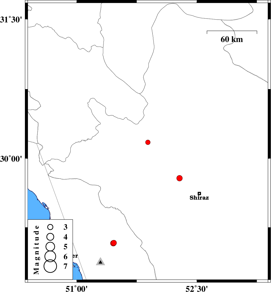 | 2016/02/25 | 10:17:29.0 | 13:47:29.0 | 29.075 | 51.457 | 9 | ML3.2 | Bushehr Province, 29 km North-East of Ahram | ||