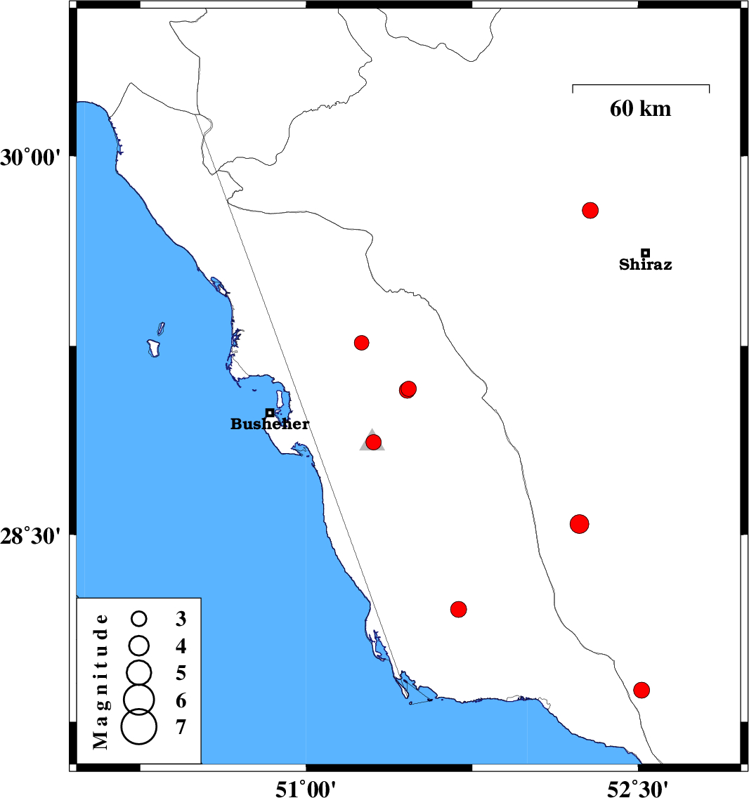 | 2016/01/30 | 11:59:34.4 | 15:29:34.4 | 29.262 | 51.251 | 6 | ML3 | Bushehr Province, 4 km of Borazjan |