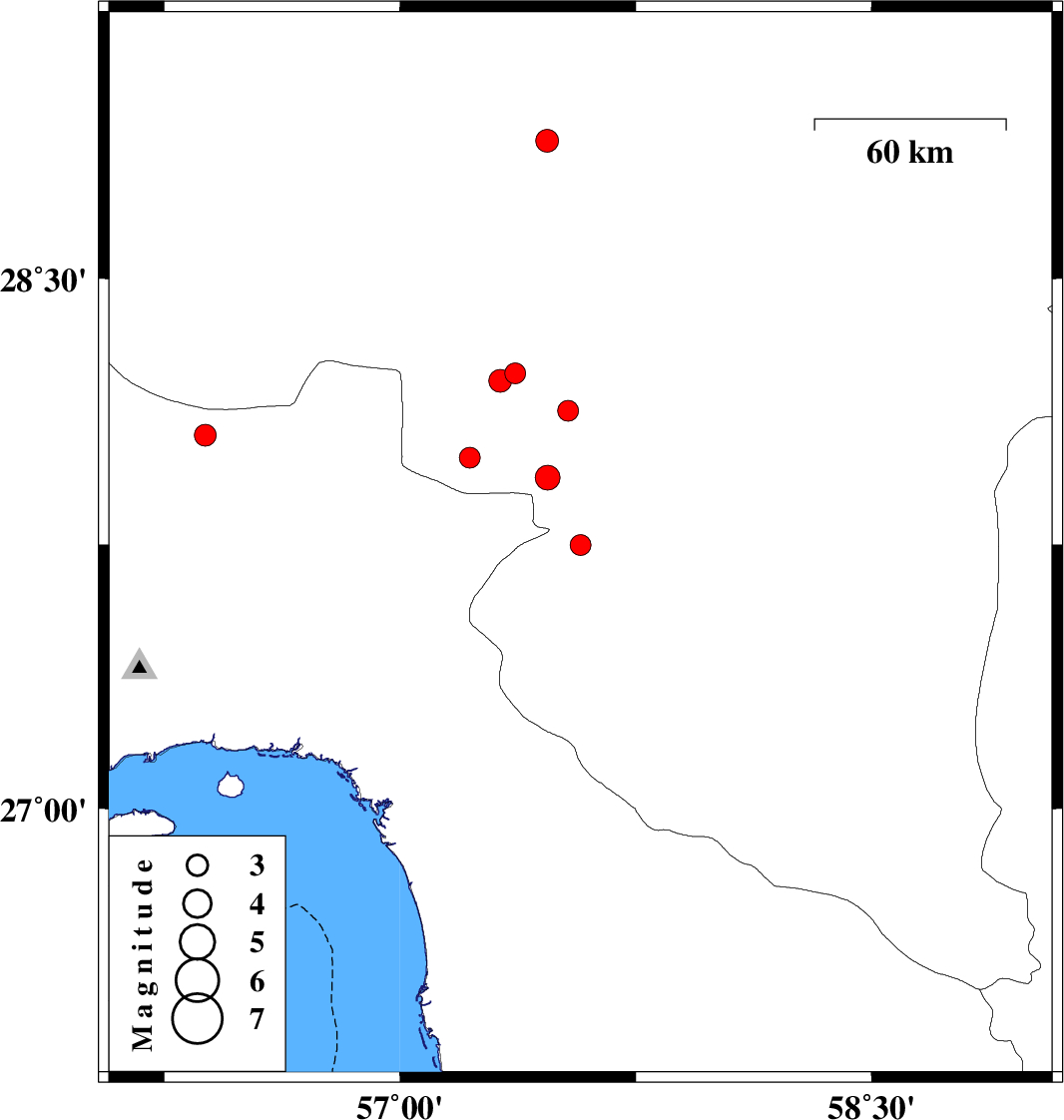 | 2016/03/02 | 07:16:07.1 | 10:46:07.1 | 27.748 | 57.574 | 14 | ML2.9 | Kerman Province, 25 km South-West of Kahnuj | ||