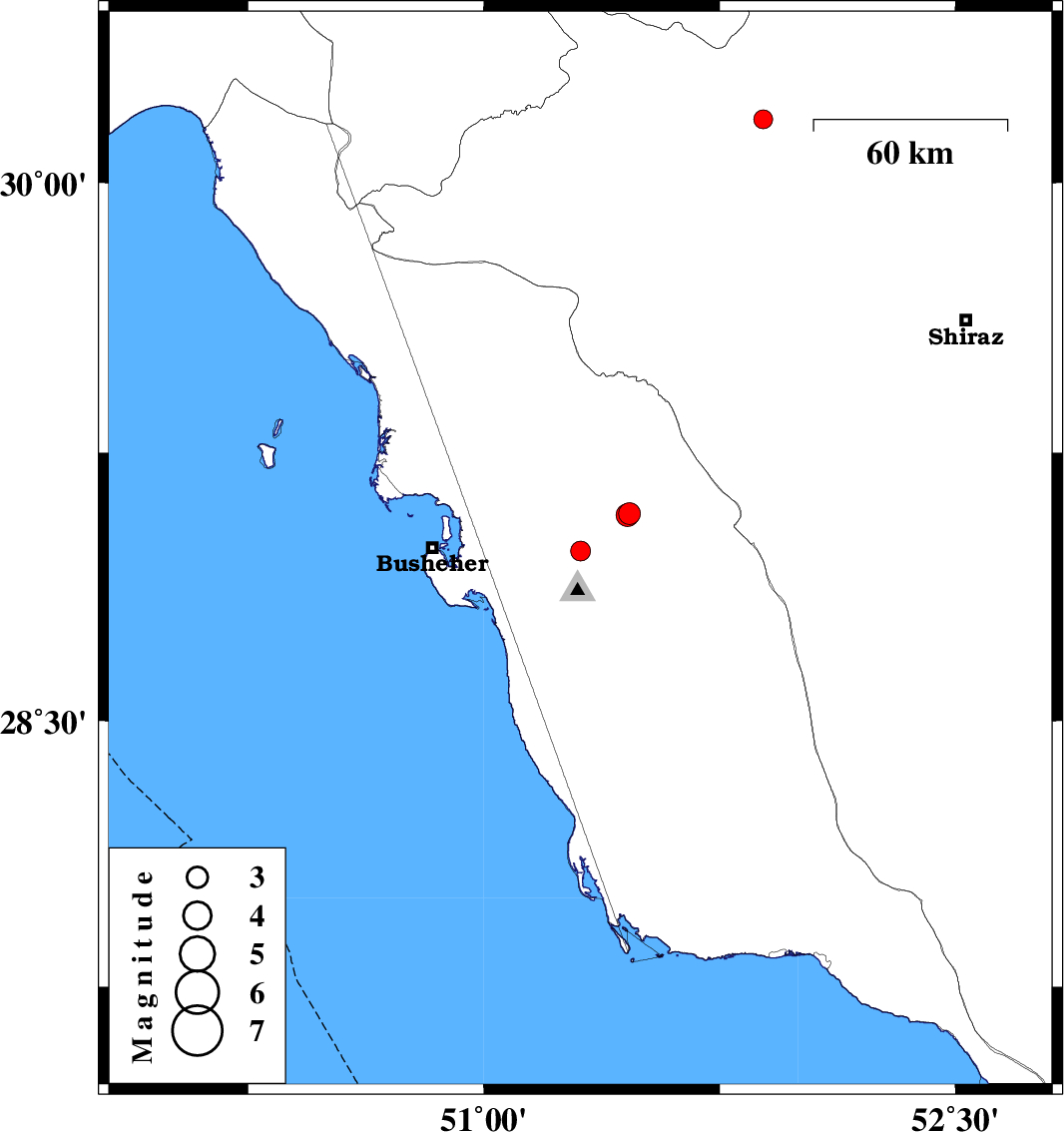 | 2016/02/25 | 13:27:38.7 | 16:57:38.7 | 29.08 | 51.463 | 8 | ML3.1 | Bushehr Province, 30 km North-East of Ahram | ||