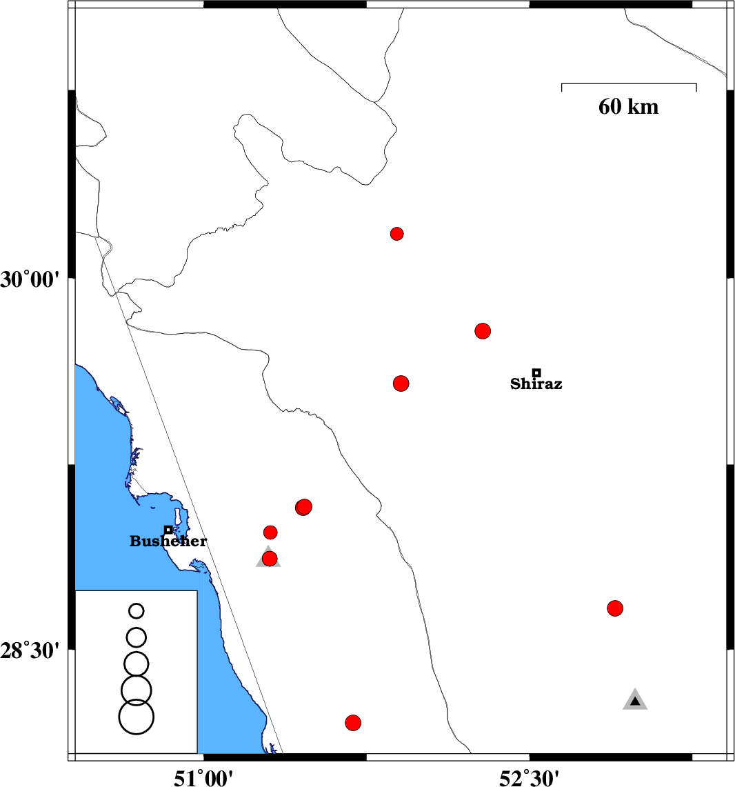 | 2016/02/22 | 05:30:40.8 | 09:00:40.8 | 29.786 | 52.284 | 14 | ML3.3 | Fars Province, 30 km North-West of Shiraz | ||