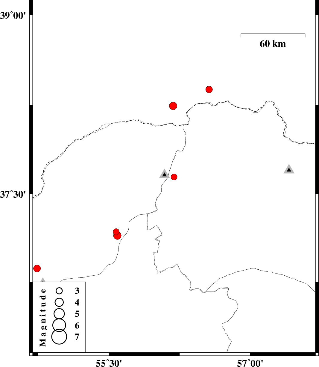 | 2016/03/13 | 03:03:19.6 | 06:33:19.6 | 37.146 | 55.589 | 15 | ML3.6 | Golestan Province, 20 km -East of Minodasht | ||