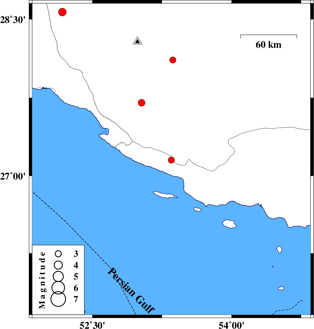 | 2016/03/28 | 19:28:28.9 | 23:58:28.9 | 27.703 | 53.03 | 14 | ML3.4 | Fars Province, 22 km North-East of Mehr | ||