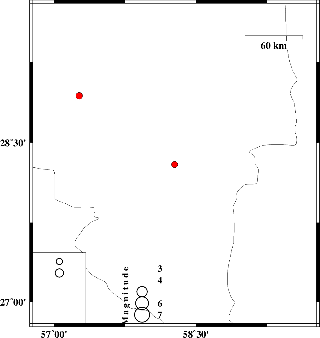 2016/03/26 | 04:42:59.3 | 09:12:59.3 | 28.937 | 57.265 | 46 | ML3.3 | Kerman Province, 55 km North-West of Jiroft |