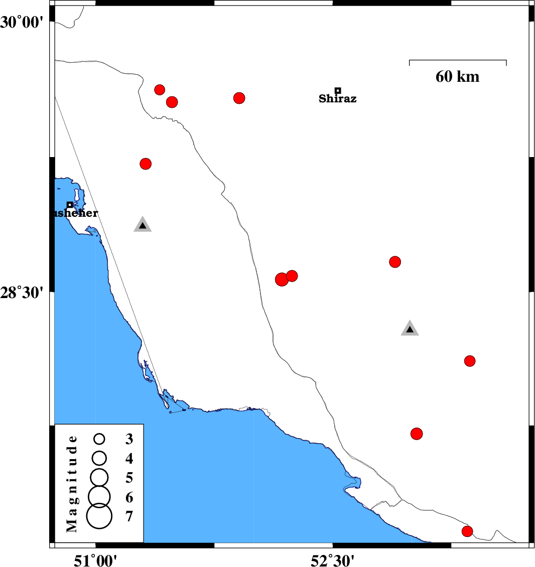 | 2016/03/08 | 03:51:53.0 | 07:21:53.0 | 28.667 | 52.894 | 14 | ML3.2 | Fars Province, 26 km North-West of Qir va Karzin |