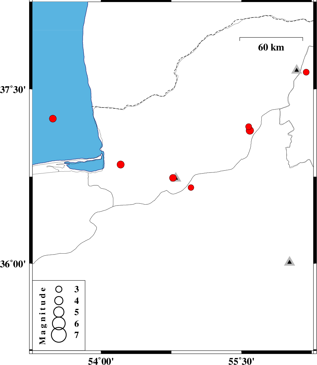 | 2016/03/10 | 13:18:28.5 | 16:48:28.5 | 37.248 | 53.485 | 14 | ML3.4 | Caspian Sea, 62 km North of Behshahr |