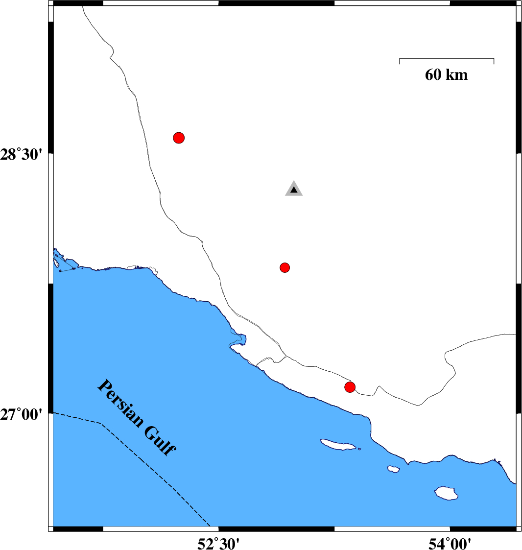 | 2016/04/02 | 02:13:30.1 | 06:43:30.1 | 27.152 | 53.351 | 14 | ML3.1 | Hormozgan Province, 27 km South-East of Lamerd |