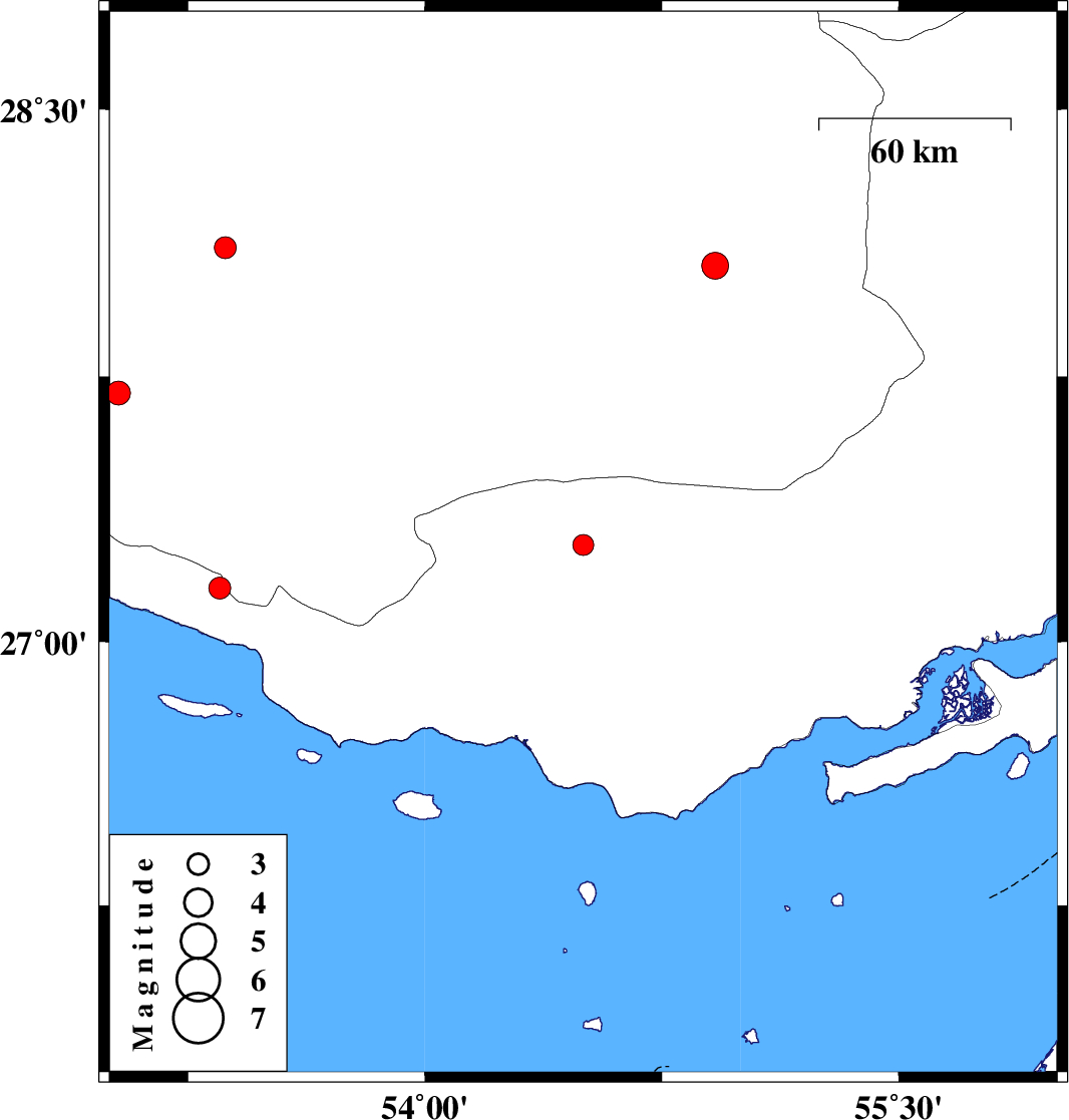 | 2016/04/02 | 02:13:30.1 | 06:43:30.1 | 27.152 | 53.351 | 14 | ML3.1 | Hormozgan Province, 27 km South-East of Lamerd | ||