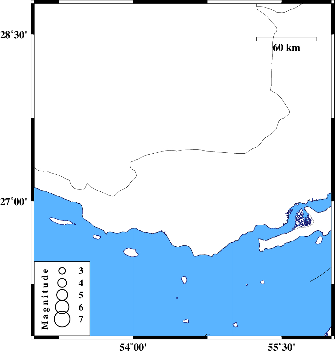 | 2016/04/15 | 00:23:26.6 | 04:53:26.6 | 27.275 | 54.501 | 15 | ML3 | Hormozgan Province, 16 km -East of Bastak |