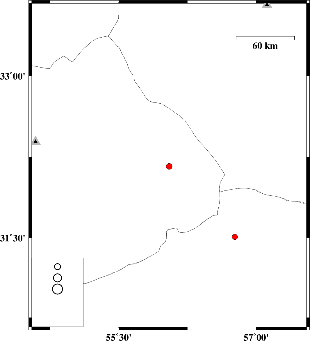 | 2016/03/24 | 15:44:40.6 | 20:14:40.6 | 32.162 | 56.05 | 14 | ML2.9 | Yazd Province, 87 km North-East of Bafq | ||