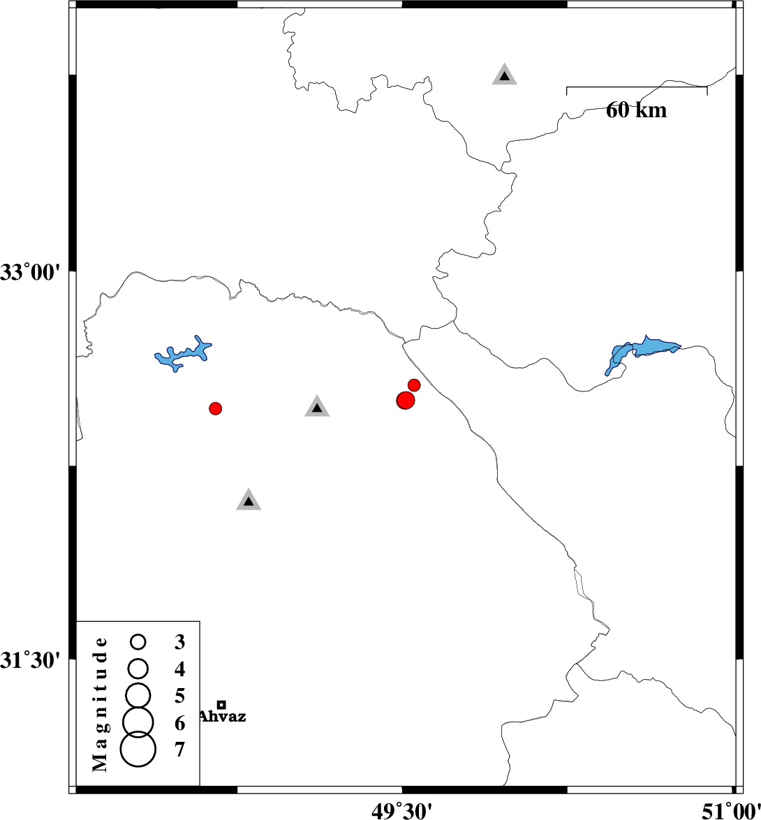 | 2016/04/11 | 13:24:35.7 | 17:54:35.7 | 32.471 | 48.651 | 23 | ML2.6 | Khoozestan Province, 28 km -East of Andimeshk |