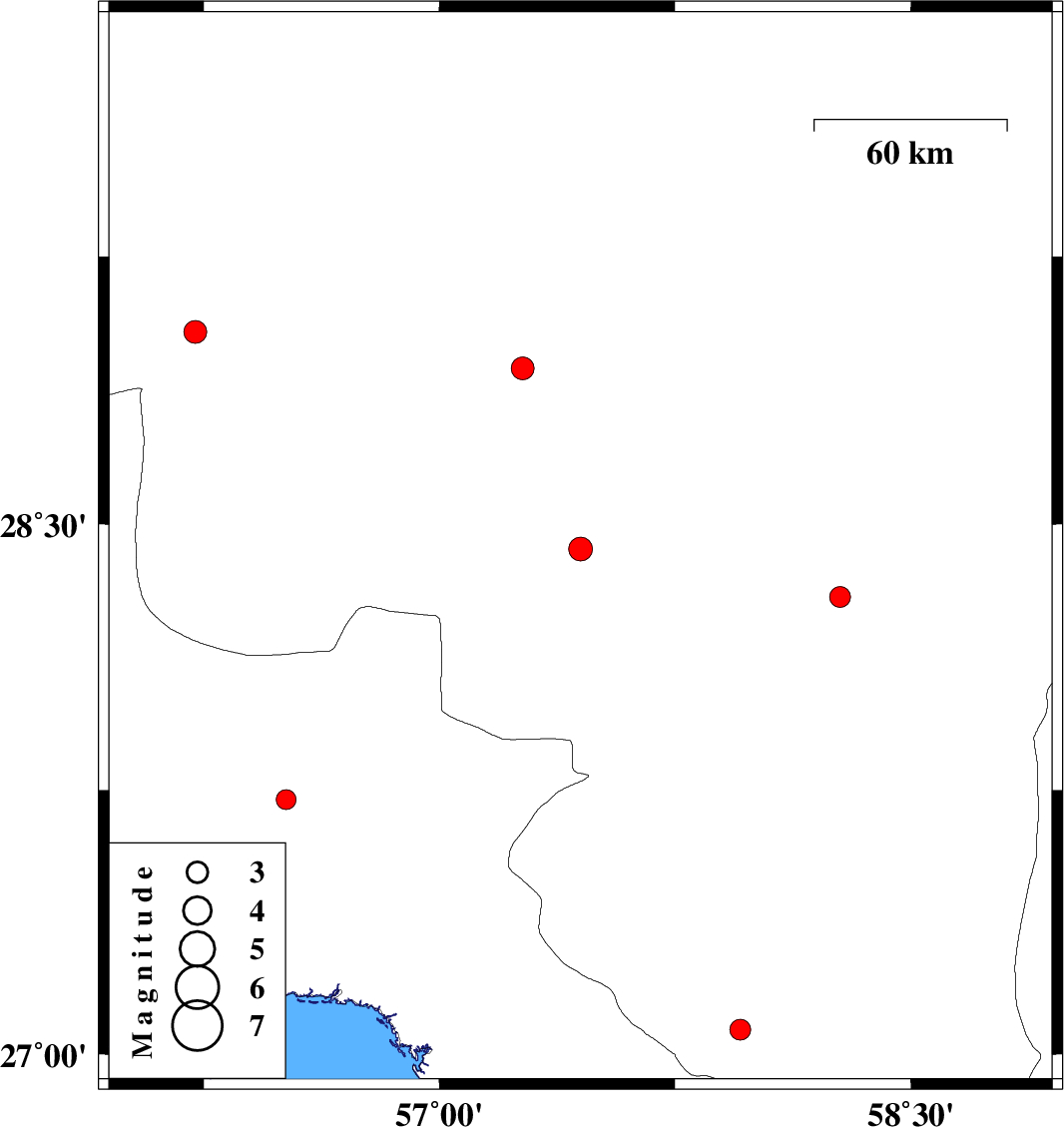 | 2016/03/26 | 04:42:59.3 | 09:12:59.3 | 28.937 | 57.265 | 46 | ML3.3 | Kerman Province, 55 km North-West of Jiroft |