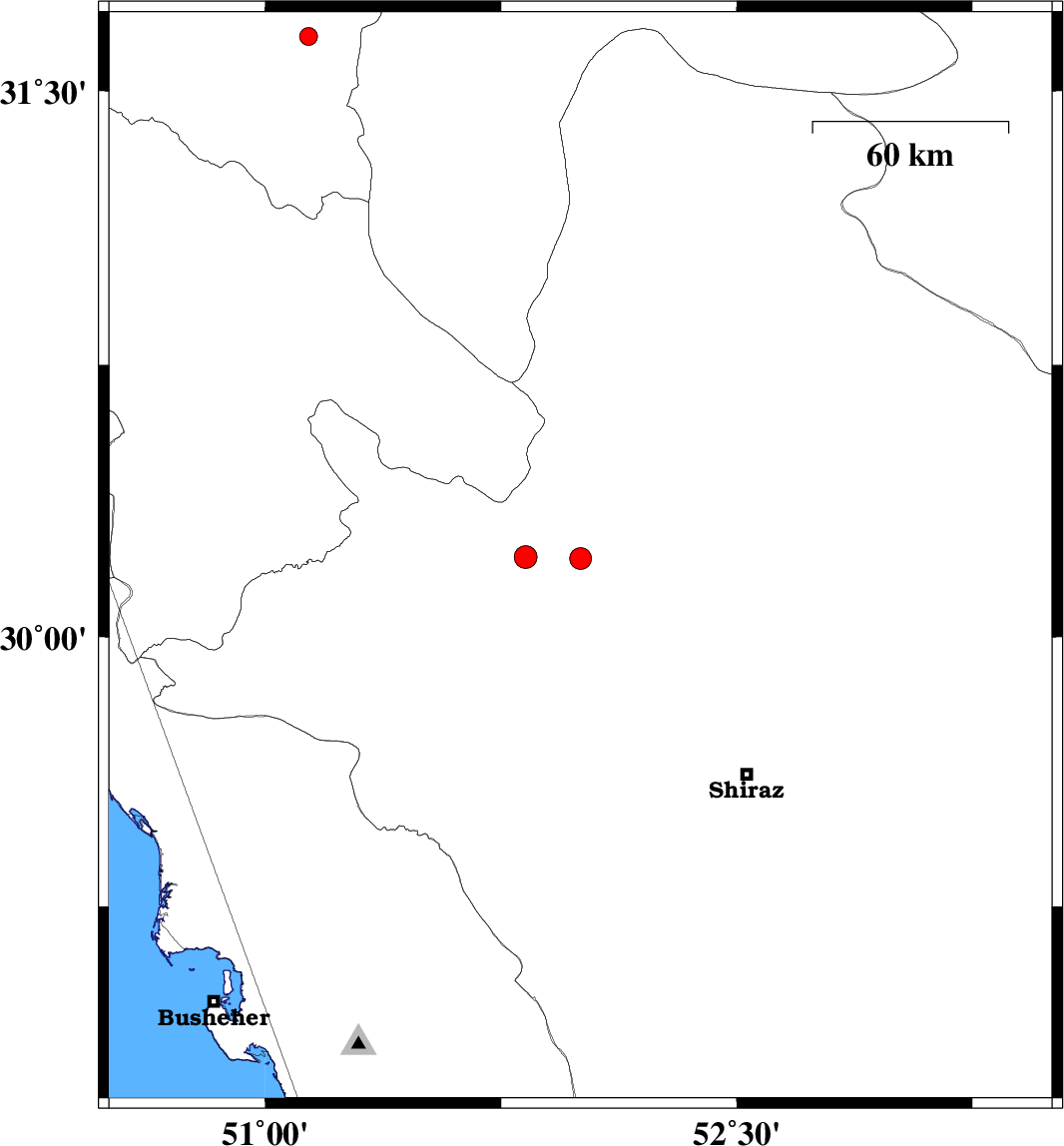 2016/04/23 | 16:38:00.1 | 21:08:00.1 | 30.22 | 51.829 | 14 | ML3.3 | Fars Province, 16 km -West of Ardakan | ||
